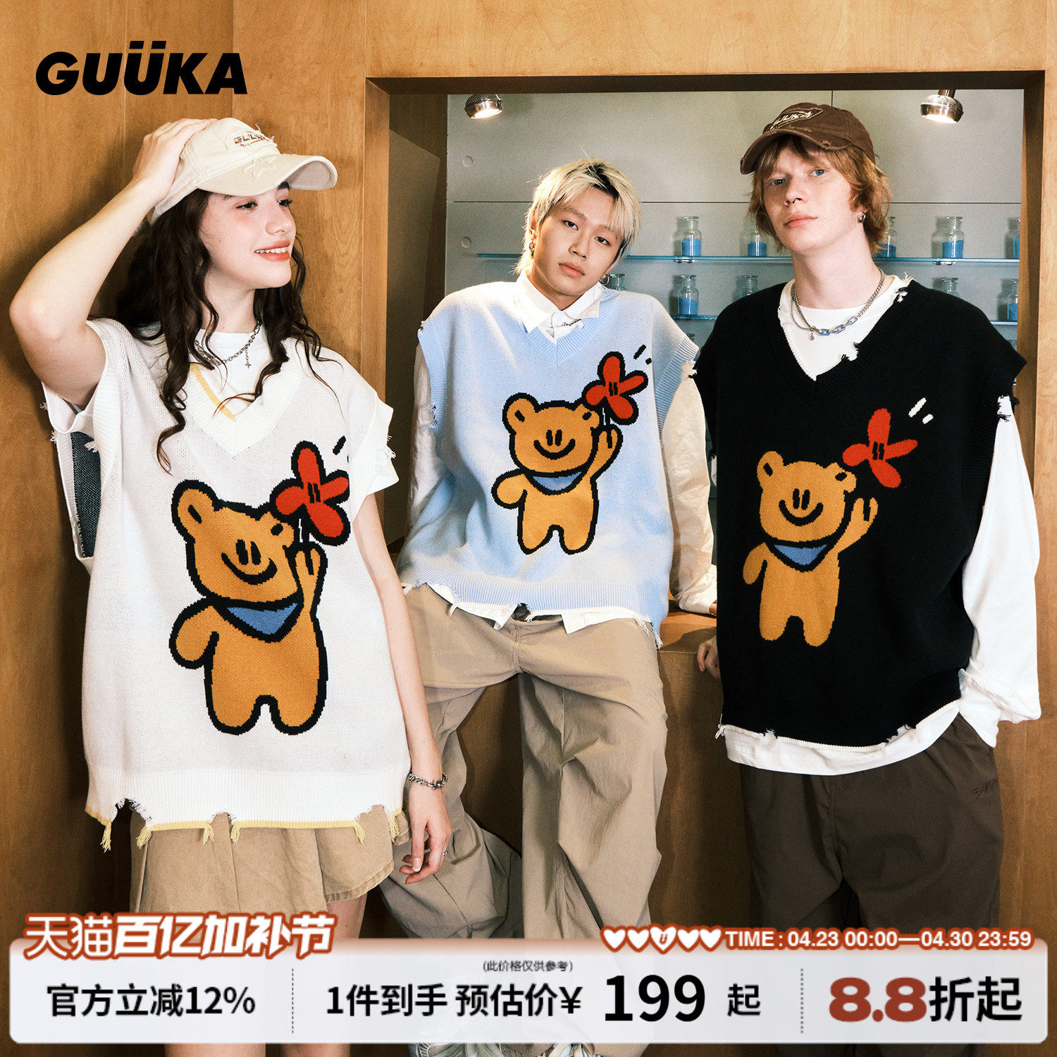 小何同款GUUKA&Agaho联名情侣毛衣背心男小熊V领马甲针织衫女宽松