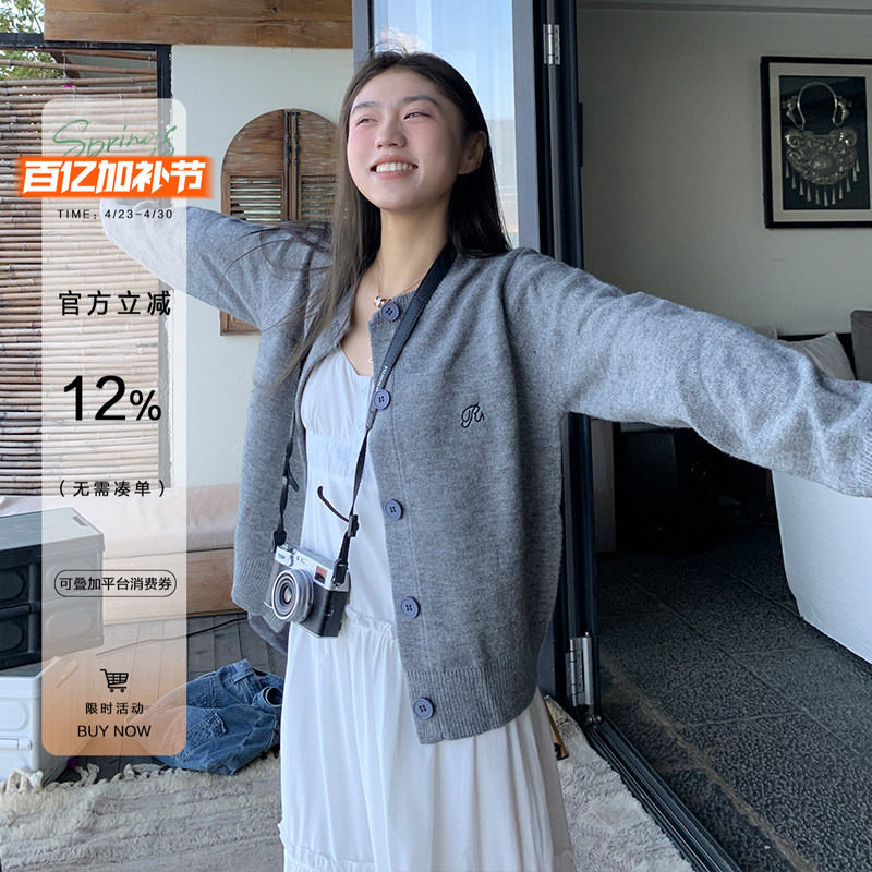 橘子树在哪儿韩系灰色针织开衫女春季款宽松显瘦百搭短款毛衣外套