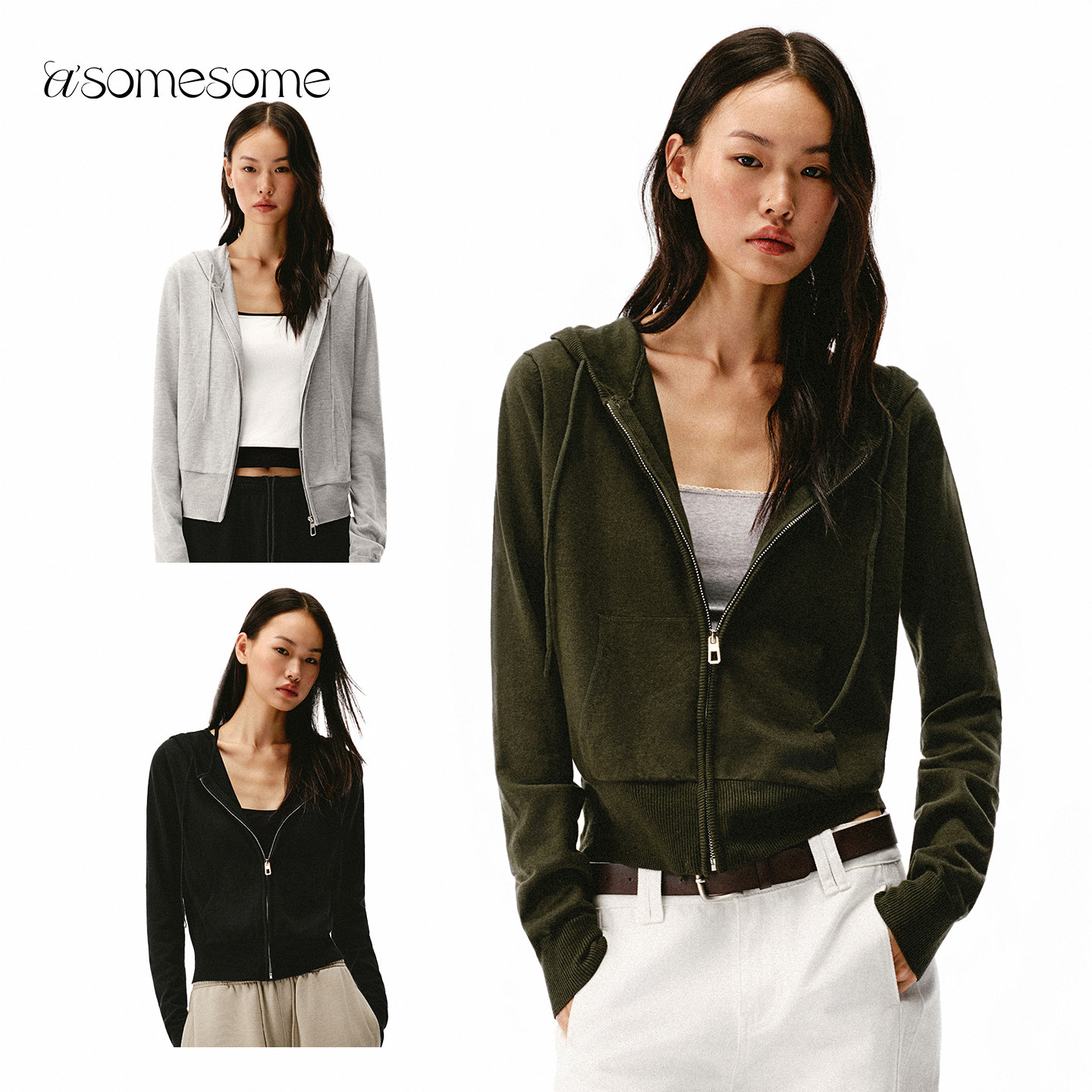 asomesome美式绵羊毛连帽拉链针织开衫毛衣外套女春宽松休闲上衣