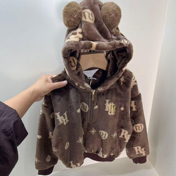 3-12岁外贸Y单秋冬款女童装 柔软毛绒拉链连帽休闲外套蝙蝠袖夹克