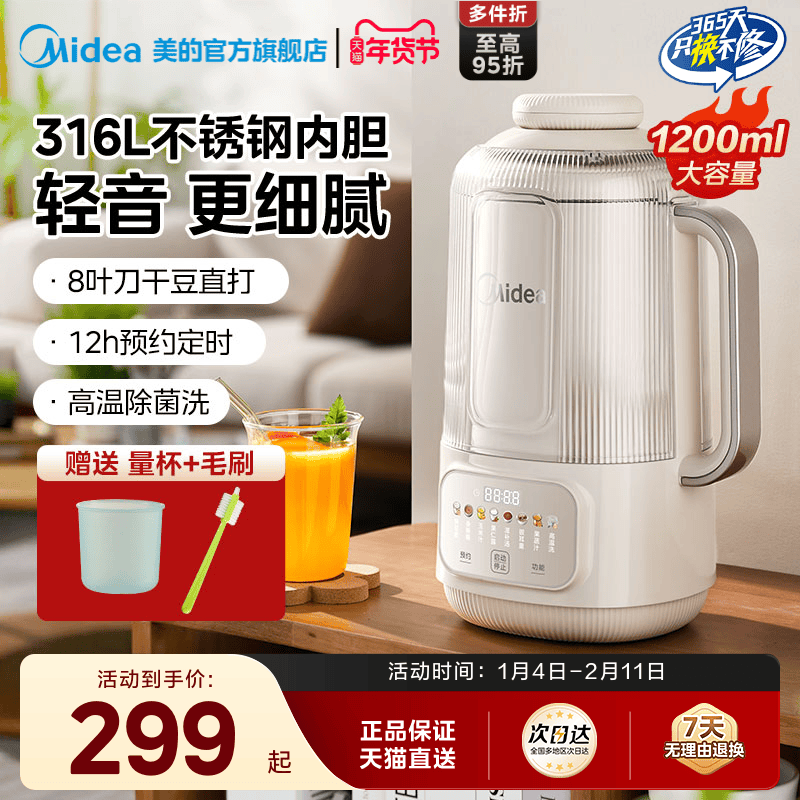 美的豆浆机全自动家用静音无渣正品破壁机榨汁机一人用小型全新款
