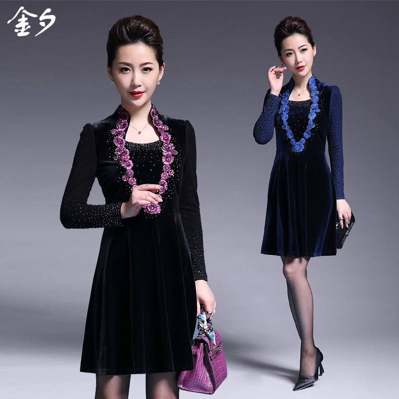 复古风刺绣中年女装秋装连衣裙长袖大码显瘦气质妈妈装金丝绒裙子
