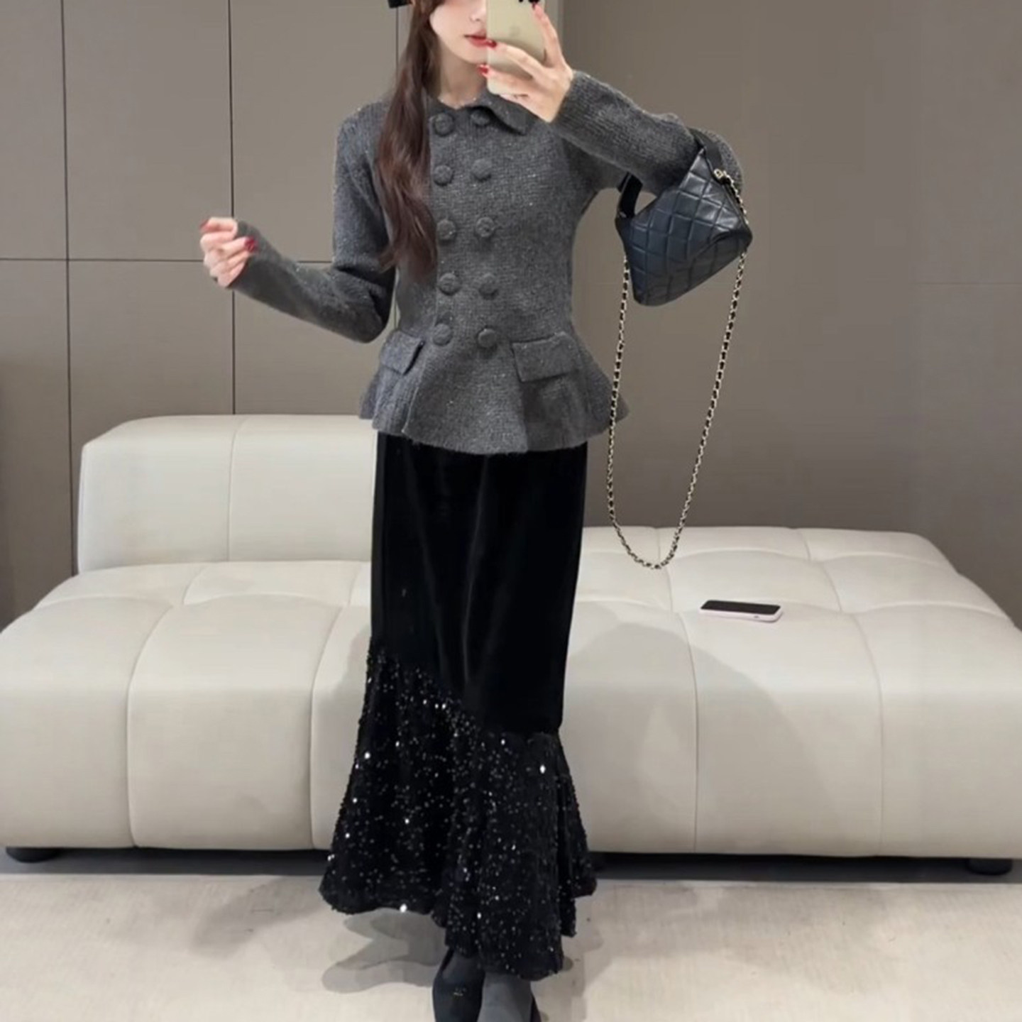 鱼尾裙黑色亮片拼金丝绒裙子亮闪闪半身裙女秋冬款松紧腰a字长裙