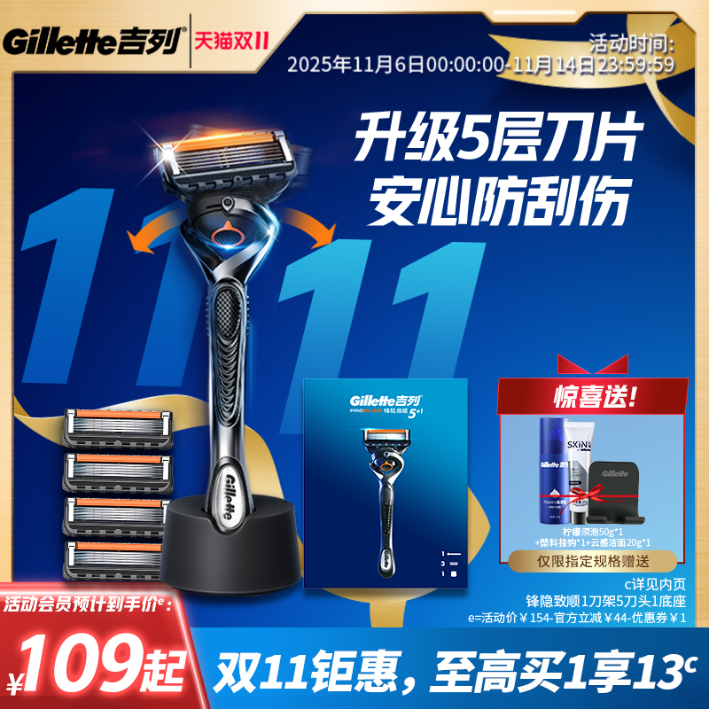 【双11立抢】吉列锋隐致顺引力盒替换刀头手动剃须刀头5层刀片