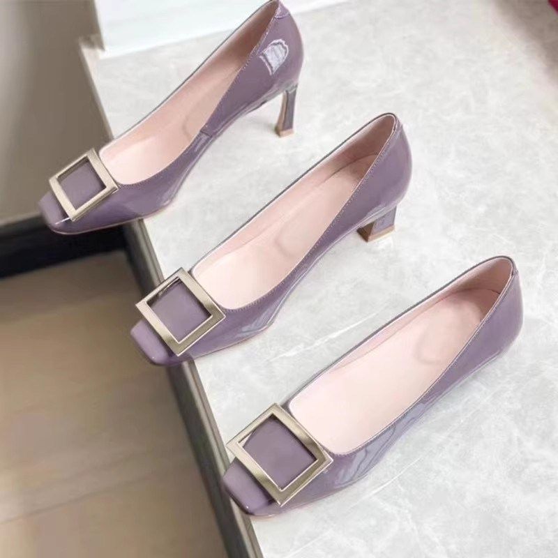2025年新款方扣法式高跟鞋女鸢尾紫方头中跟女鞋粗跟漆皮通勤单鞋