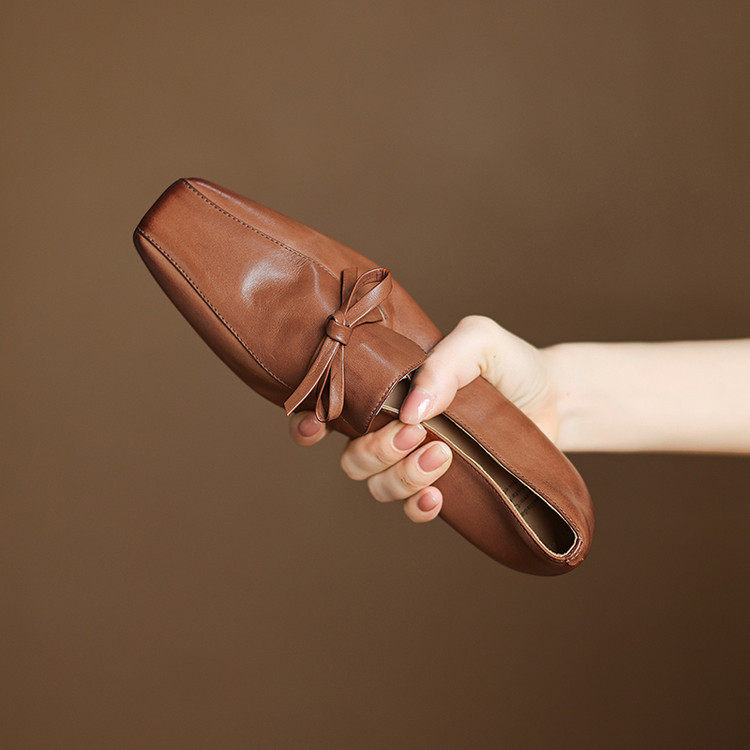 法式蝴蝶结真皮一脚蹬乐福鞋女2025春秋季新款小方头中跟女鞋春夏