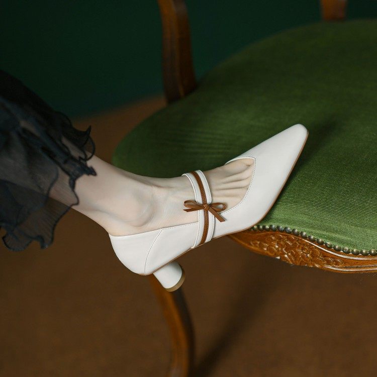 2023春秋款百搭拼色蝴蝶结玛丽珍单鞋细跟牛皮小方头中跟女鞋