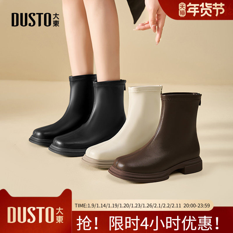 大东时装靴女鞋2025年冬季新款粗跟中跟后拉链方头优雅短靴D0014