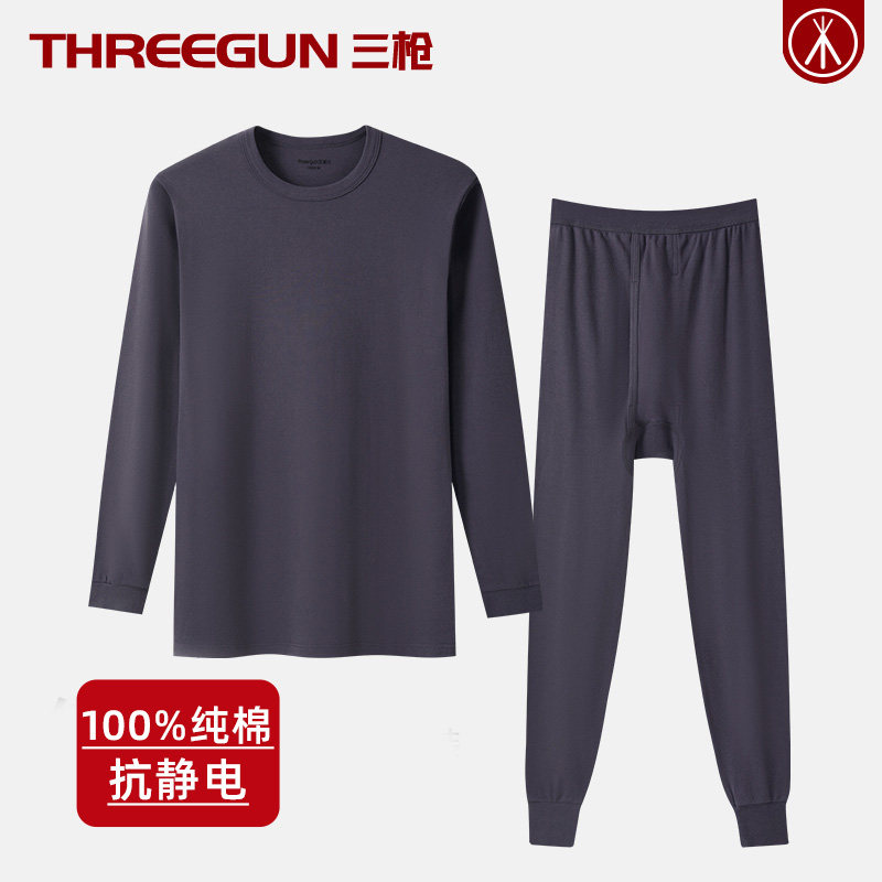 三枪100%纯棉男士薄款保暖内衣套装全棉男青年秋衣秋裤打底衫冬季