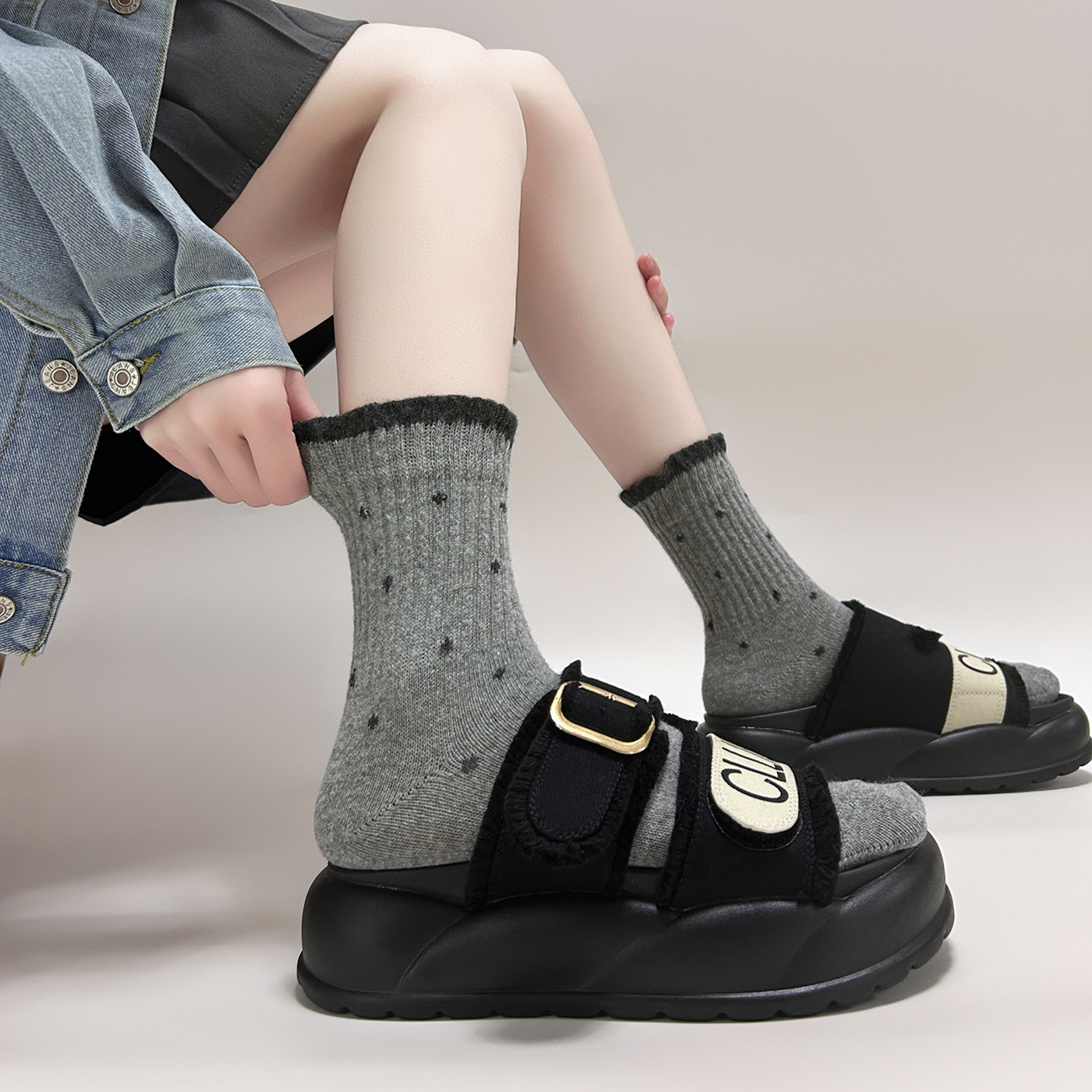 波点羊毛袜子女中筒袜秋冬季纯棉保暖加厚长袜配勃肯鞋冬天堆堆袜