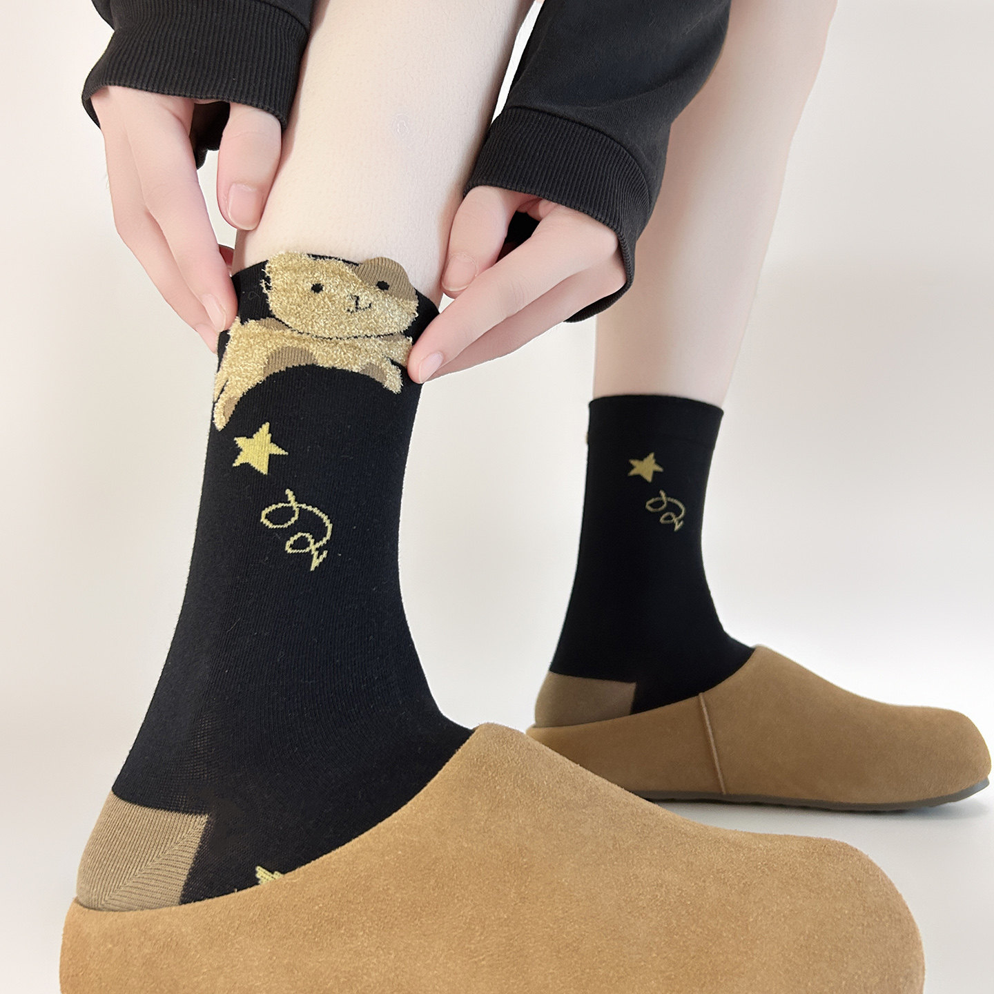 费尔岛中筒袜女冬季灰色卡通可爱刺绣小熊袜子纯棉配小皮鞋的袜子