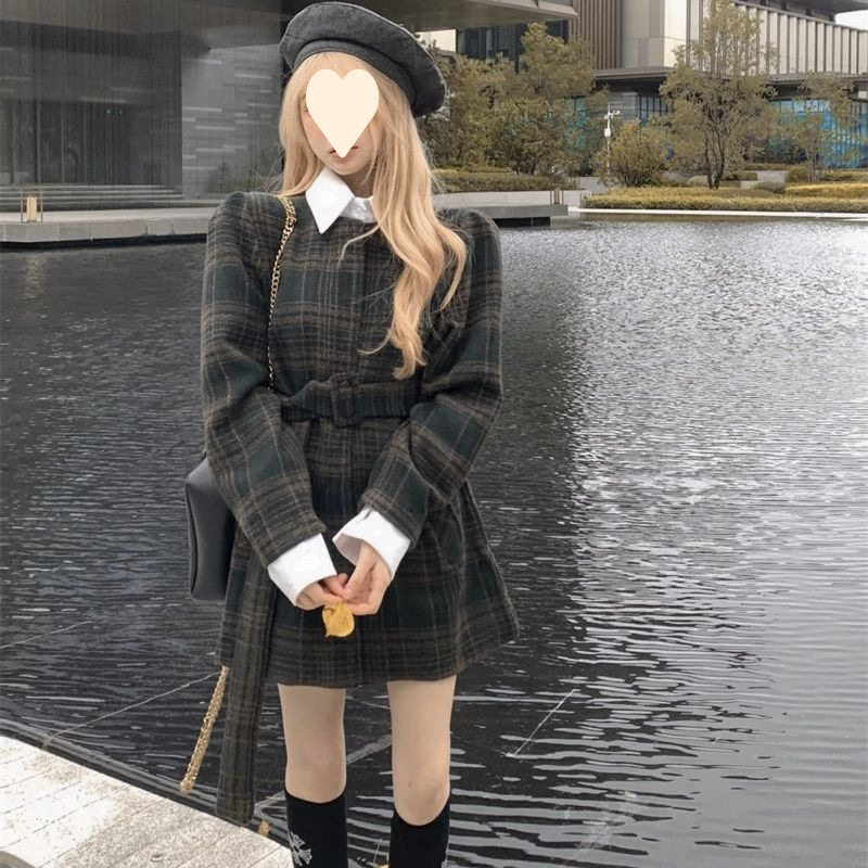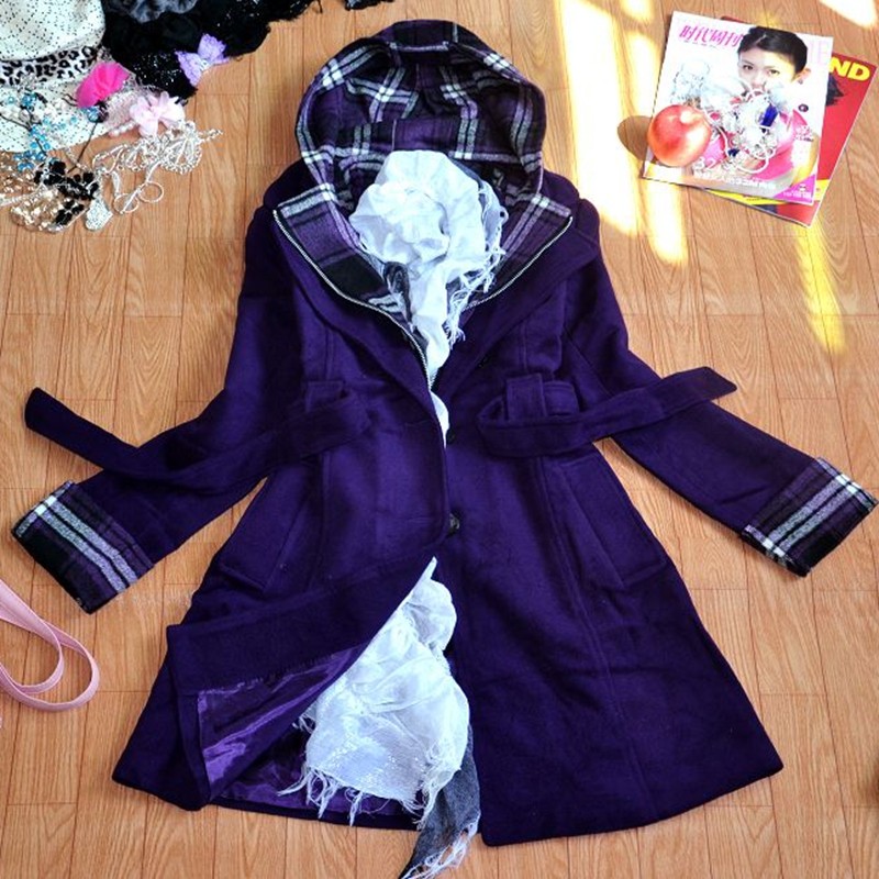 格子连帽腰带加厚保暖羊毛呢长袖中长款外套风衣大衣女春冬装开衫
