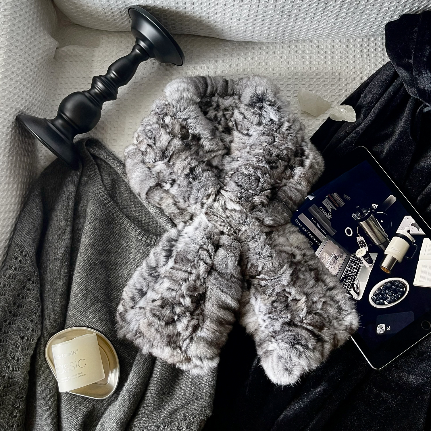 黎宿手工编织龙猫围巾高级百搭皮草围脖黑丝绒栗鼠毛青紫蓝毛领子