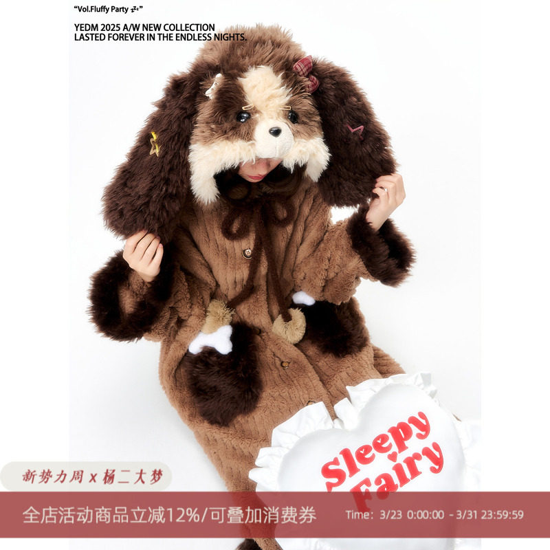 杨二大梦原创设计棕色拼色小狗睡裙加厚加绒睡衣冬女款2025居家服