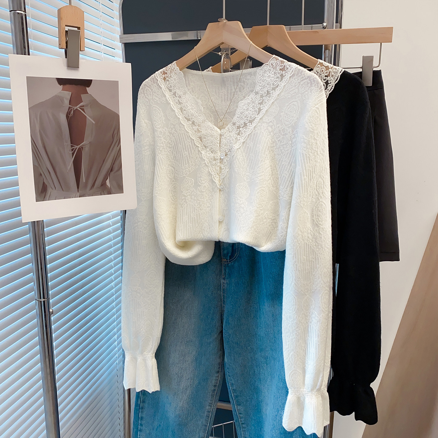 蕾丝喇叭袖v领毛衣女2025秋冬新款宽松外穿针织开衫内搭打底衫潮