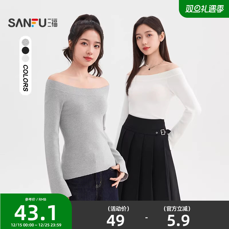 三福毛衣2025新款秋季气质喇叭袖露肩打底衫修身显瘦纯色上衣女装