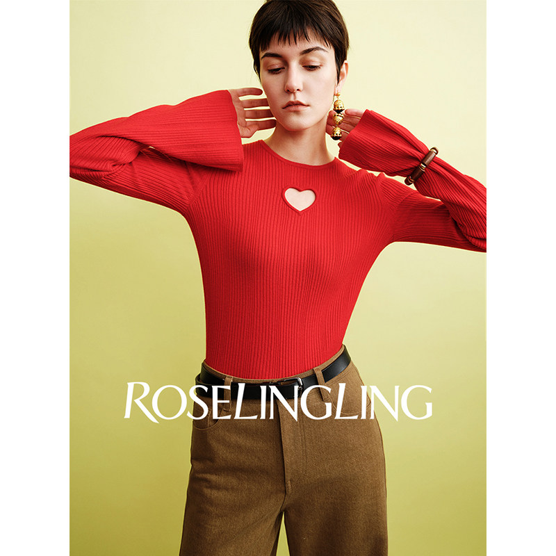 ROSELINGLING新年红色毛衣 精纺羊毛心形镂空显瘦打底喇叭袖上衣