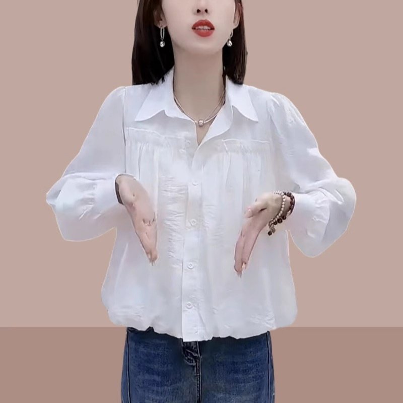 韩版白色翻领长袖衬衫女春秋季新款宽松休闲通勤气质上衣简约时尚