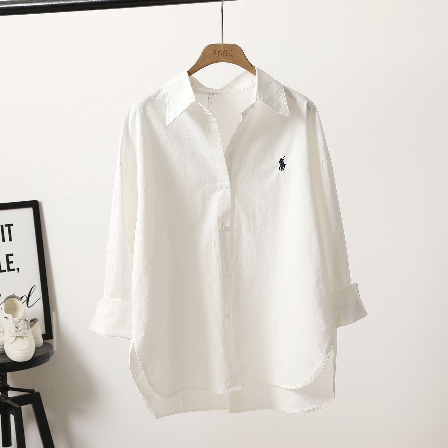韩版休闲宽松白色衬衫女春季新款小马刺绣水洗棉长袖百搭内搭衬衣