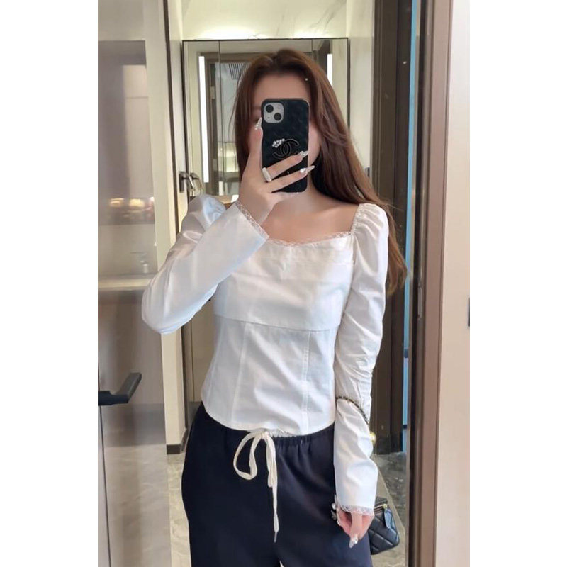 韩版方形领蕾丝边衬衫女设计感甜美优雅修身显瘦休闲百搭白色上衣