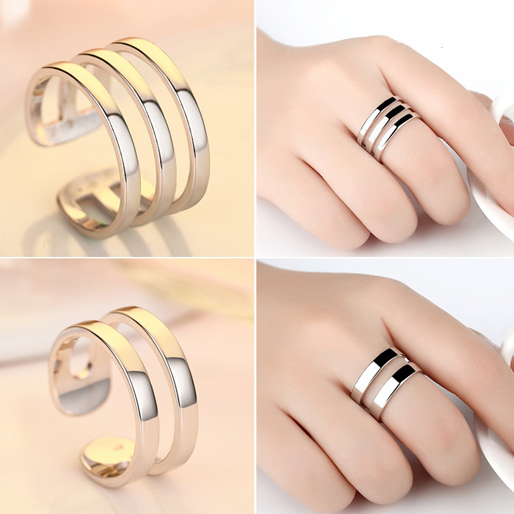 日韩版S925纯银戒指男简约双多层个性三圈开口光面情侣指环尾戒女