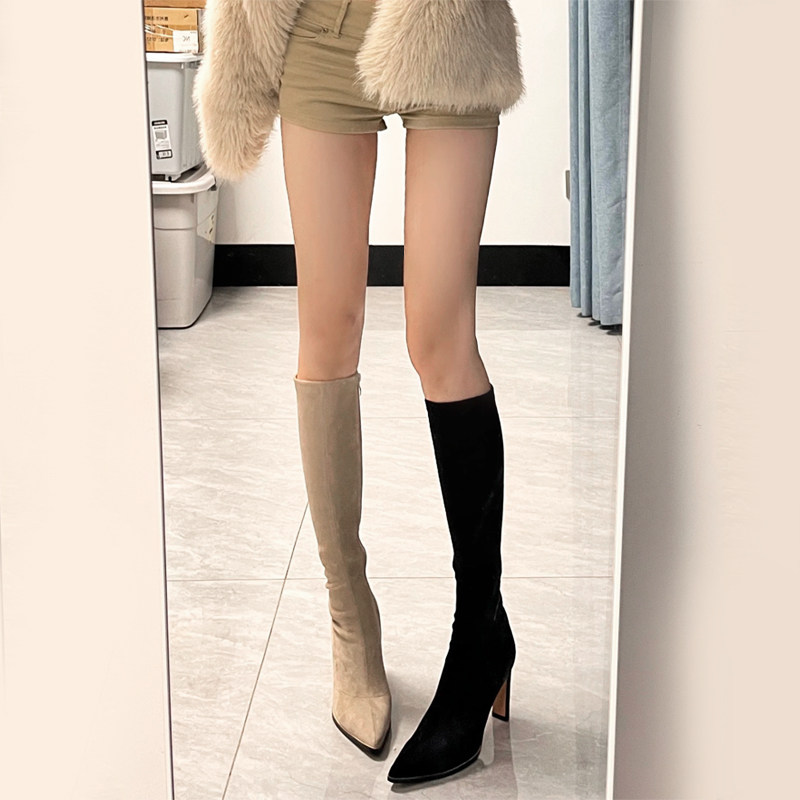 高跟尖头长筒靴女绒面千金风2025新款侧拉链粗跟不过膝高筒弹力靴