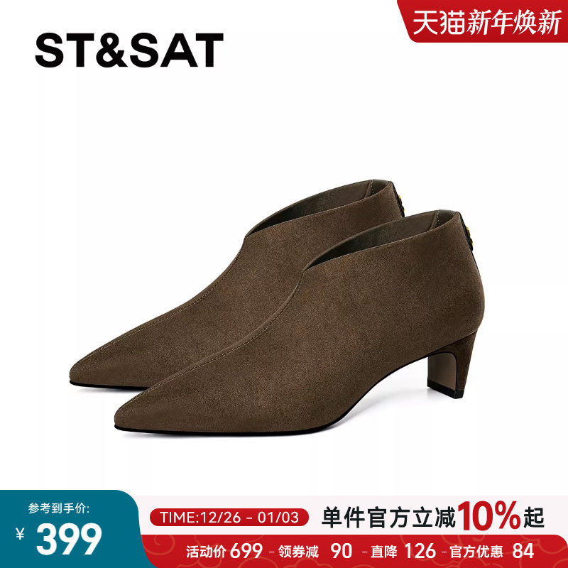 星期六尖头高跟鞋女2025秋冬真皮粗跟绒面磨砂短靴棕色气质瘦瘦靴