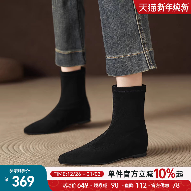 星期六黑色尖头短靴女2025新款秋冬靴子绒面平底弹力袜靴瘦瘦靴鞋