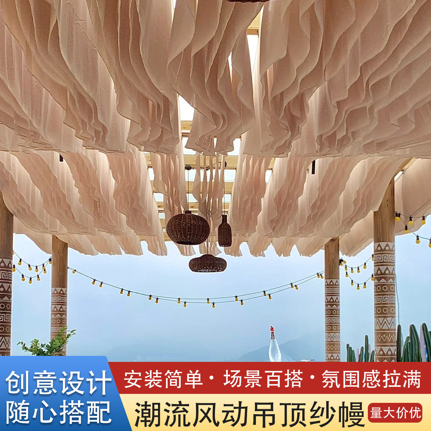 网红风动纱幔吊顶布幔户外餐厅民宿装饰纱幔酒店景区波浪风动布幔