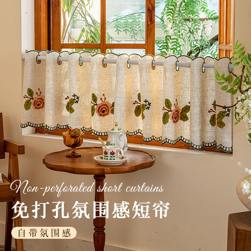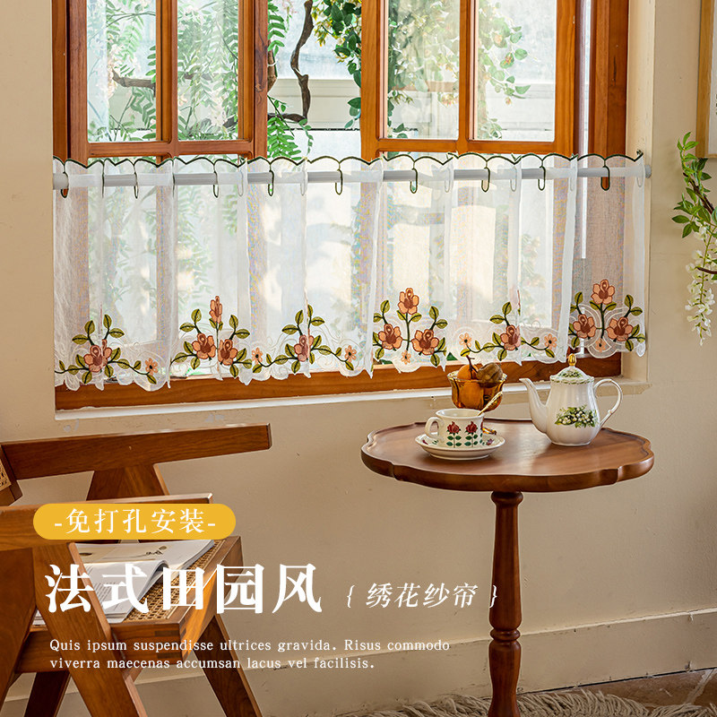 田园刺绣窗户短帘免打孔半帘隔断帘厨房窗户遮挡帘高级感装饰纱帘