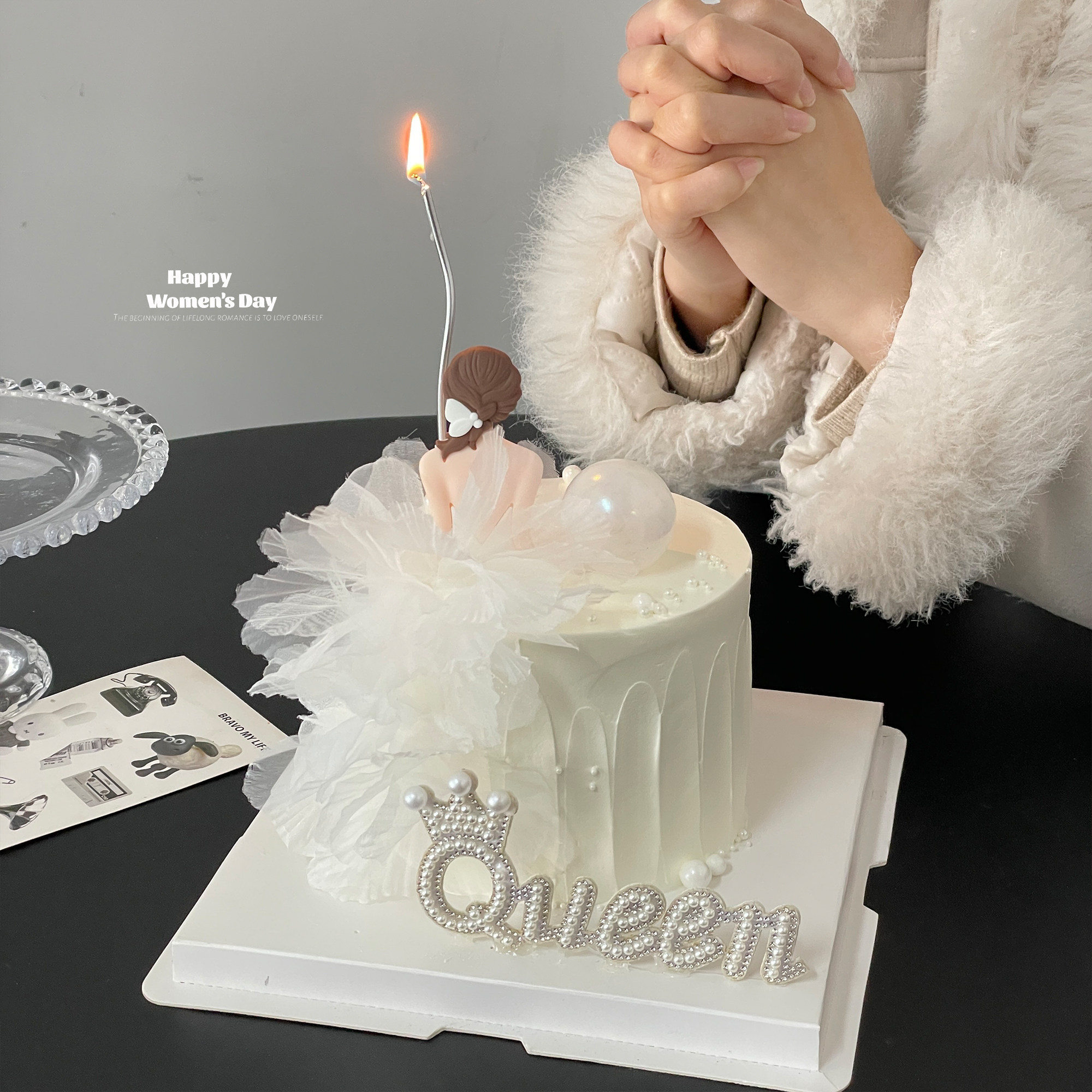 38女神节蛋糕装饰品珍珠queen摆件唯美网纱裙摆背影女神装扮插件