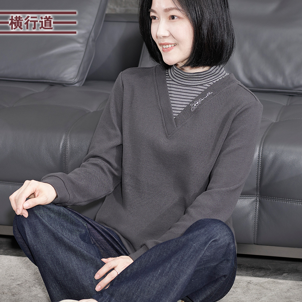 半高领条纹假两件拼接卫衣2025秋冬装宽松内搭打底衫长袖女士上衣