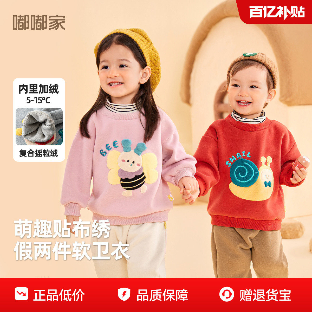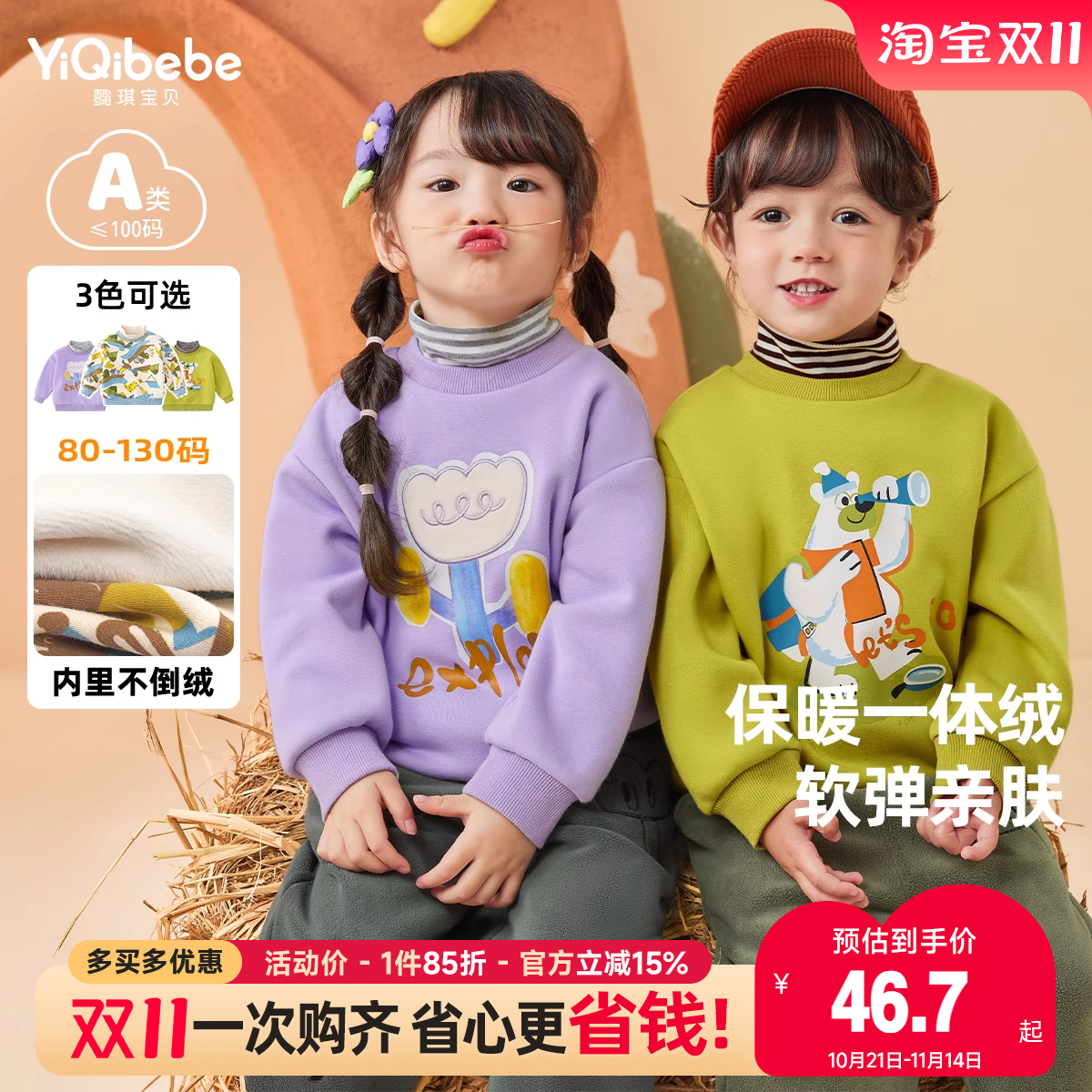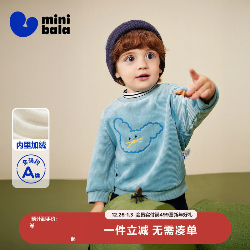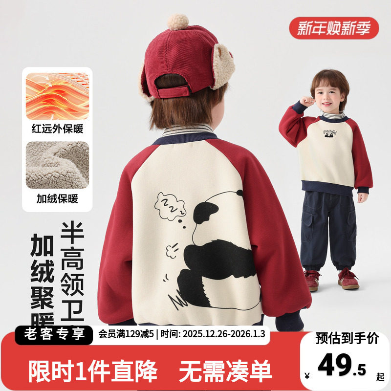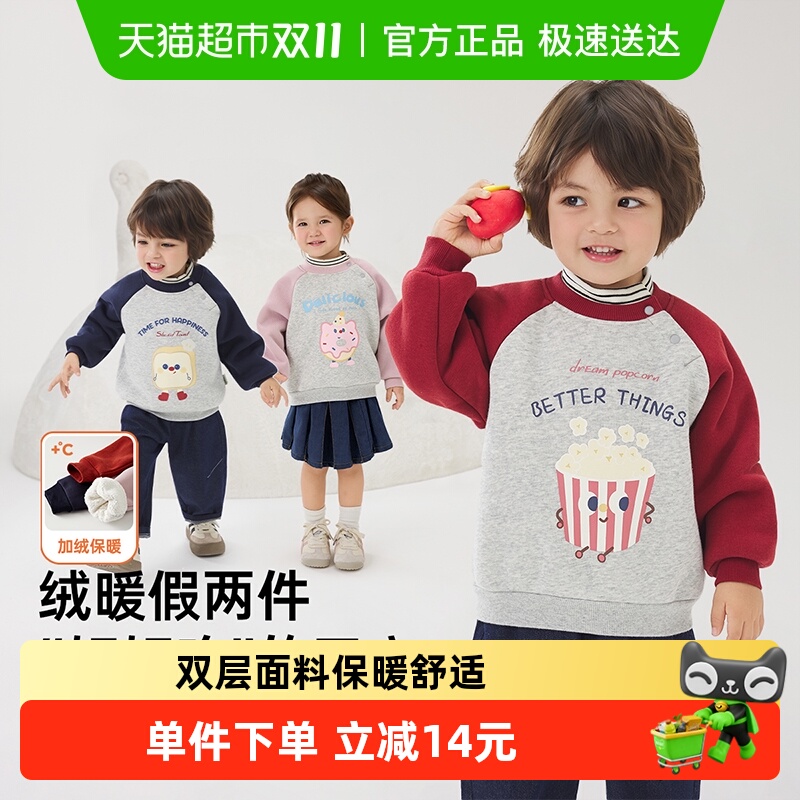迷你巴拉男女童宝宝软卫衣2025冬保暖内里加绒假两件双层高领上衣
