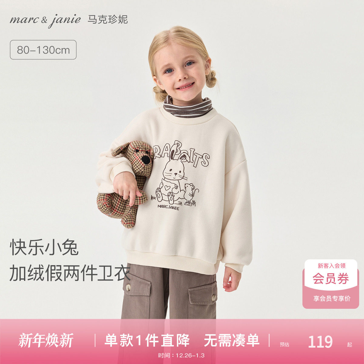 [加绒]马克珍妮女童可爱兔子假两件高领卫衣 宝宝冬装新款551187
