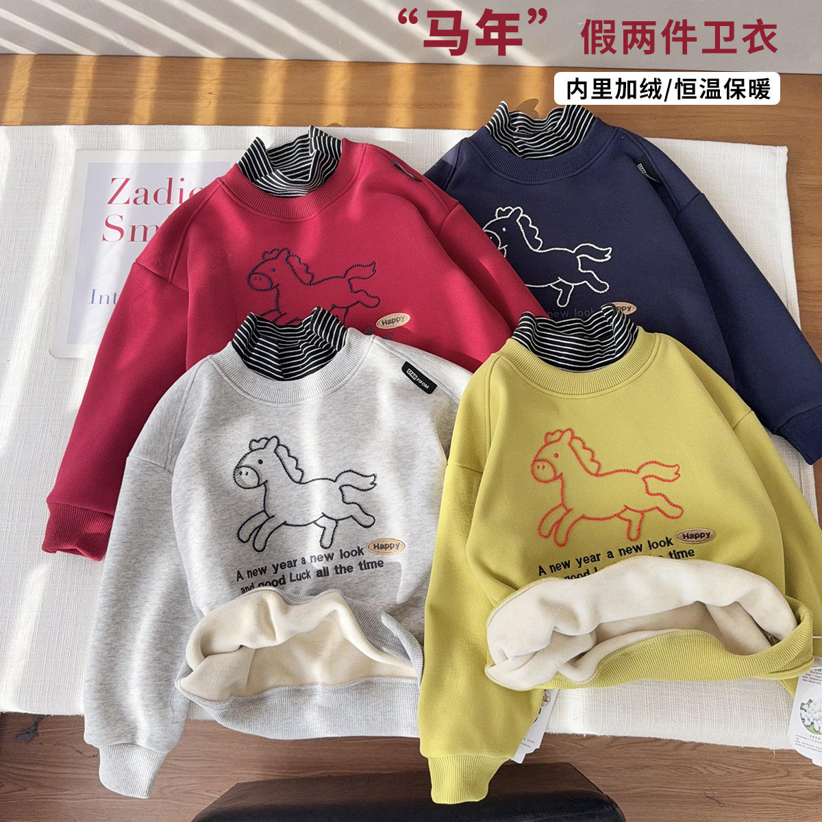 【小马假两件加绒卫衣】新年半高领羊毛蚕丝绒保暖上衣男女童卫衣