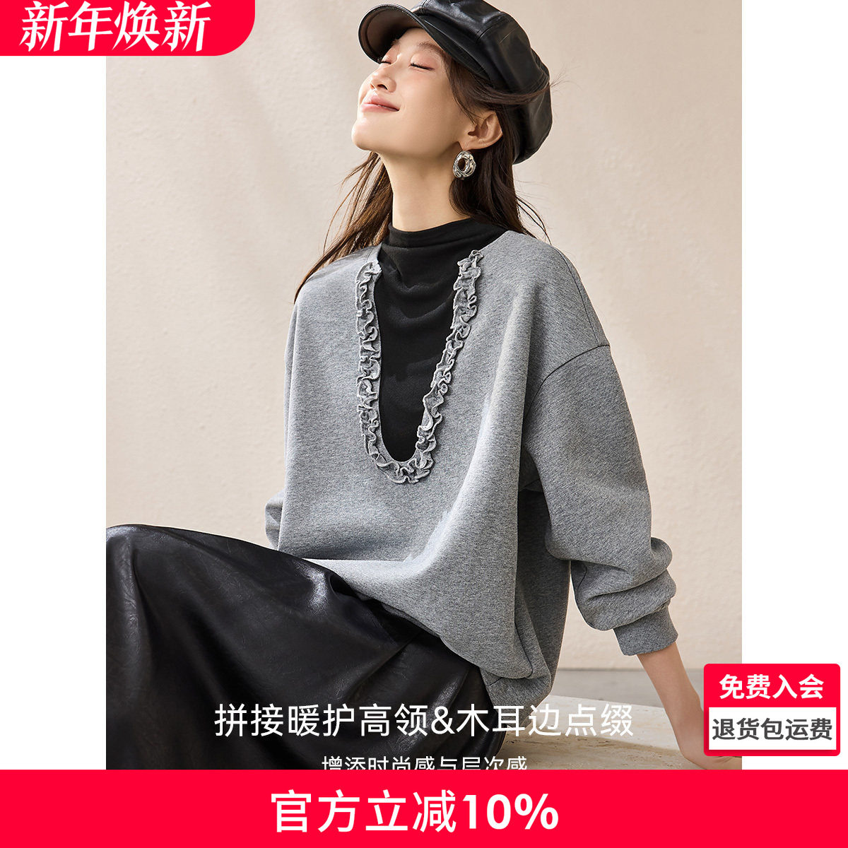飞鸟和新酒假两件半高领灰色卫衣女2025冬季新款宽松休闲上衣