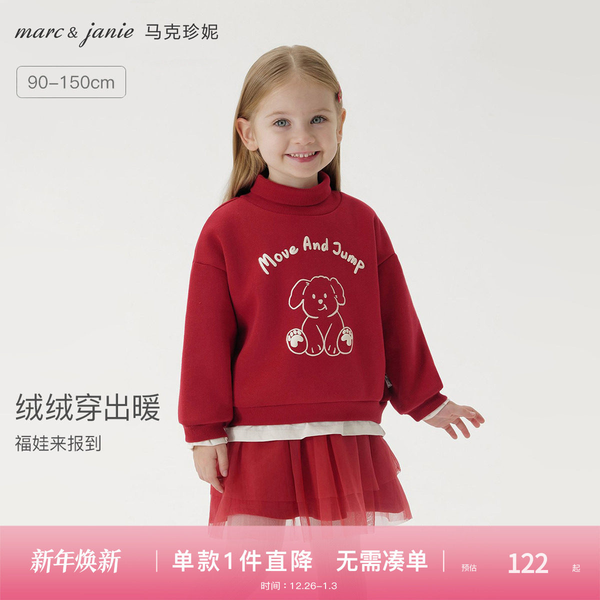 [加绒]马克珍妮女童可爱小熊假两件高领卫衣宝宝新年红冬装541925