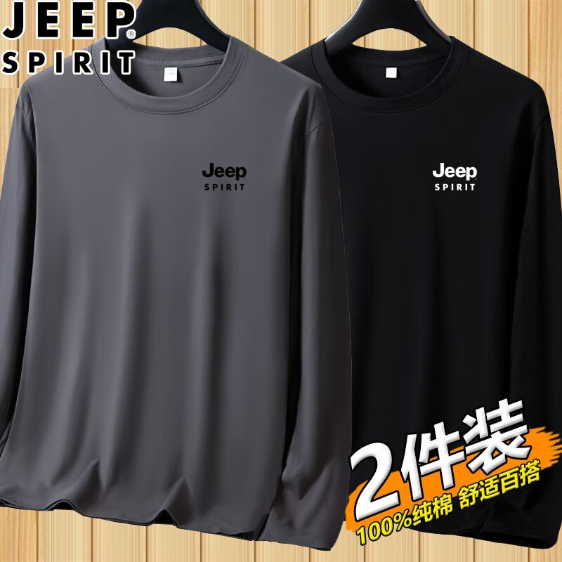 JEEP吉普两件装长袖t恤男春秋男士纯棉圆领宽松休闲T恤百搭打底衫