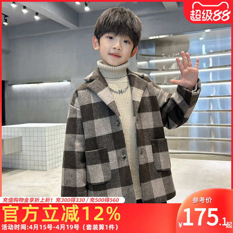 男童格纹呢子大衣夹棉加厚冬装新款2026儿童西装毛呢外套格子冬季