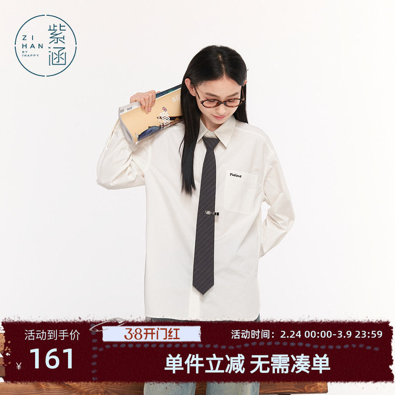 贴标抽绳长袖衬衣女2026早春新款潮流时尚宽松百搭纯色圆领衬衫潮