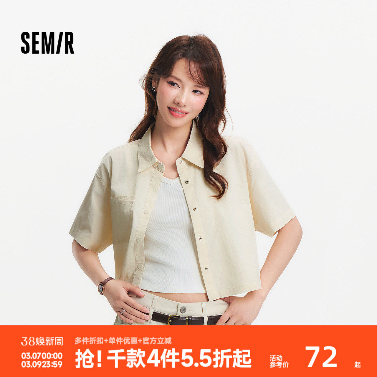 森马短袖衬衫女夏季短款纯色宽松肌理落肩翻领盐系休闲工装风衬衣