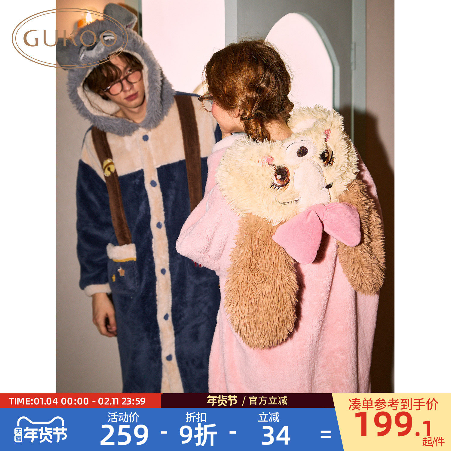 Gukoo/果壳情侣睡衣迪士尼新款女睡袍冬季珊瑚绒保暖连帽睡衣男D