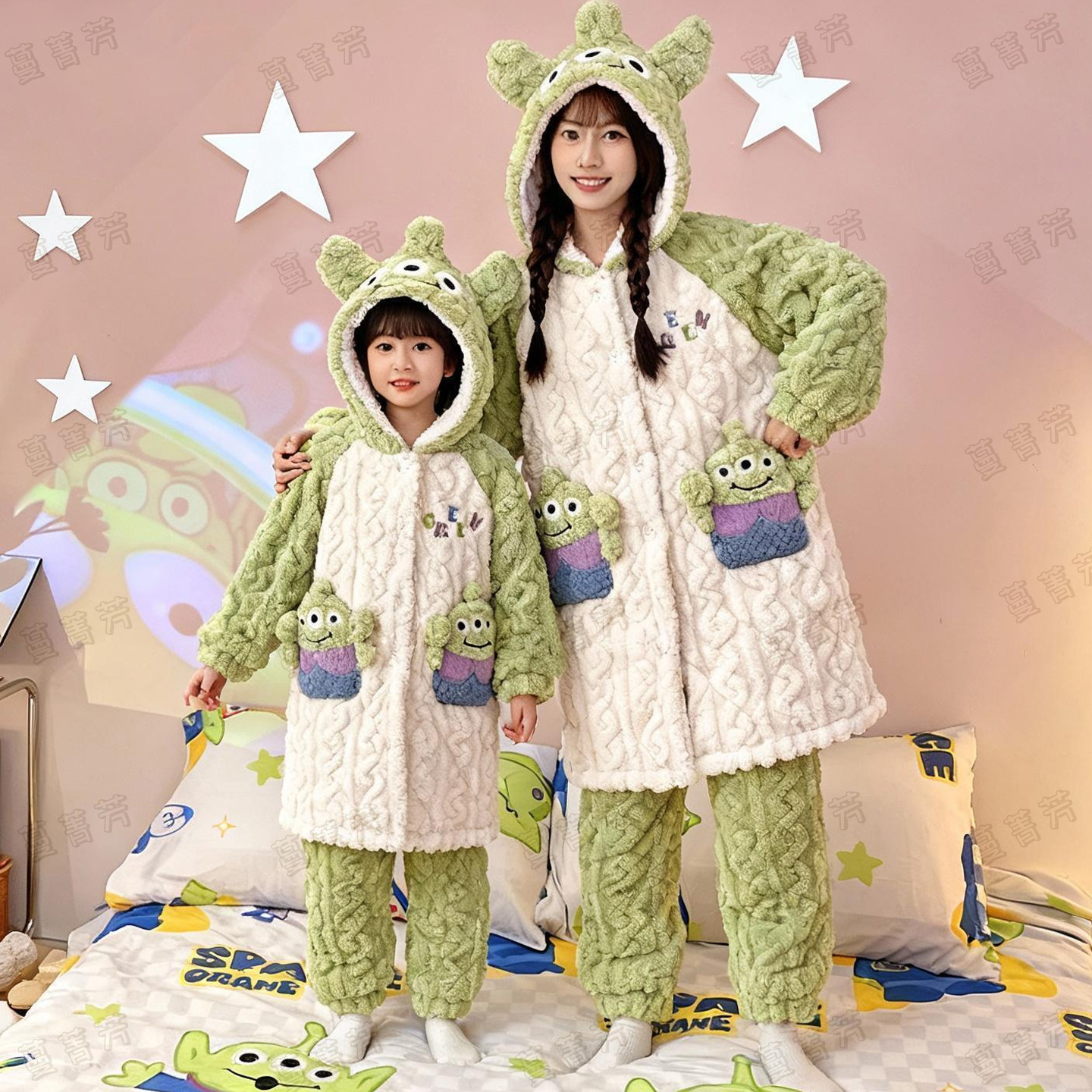 女童睡衣母女睡袍冬季三层夹棉加绒加厚珊瑚绒三眼仔亲子装家居服