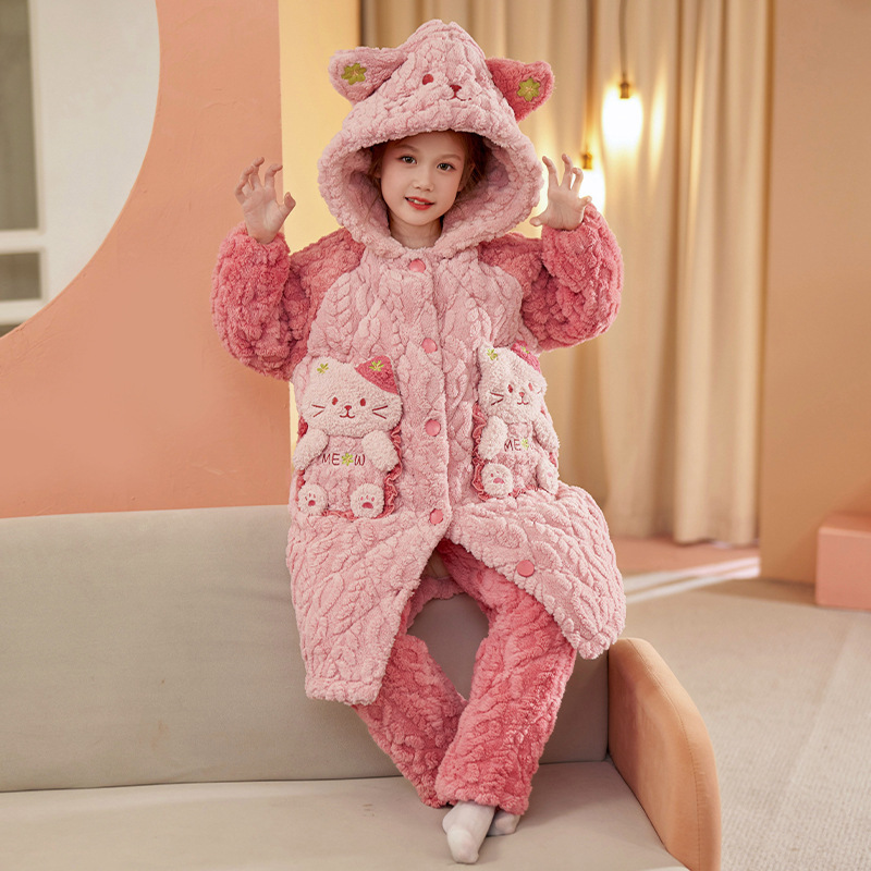 儿童睡衣母女睡袍冬季三层夹棉加绒加厚冬款珊瑚绒女童亲子家居服