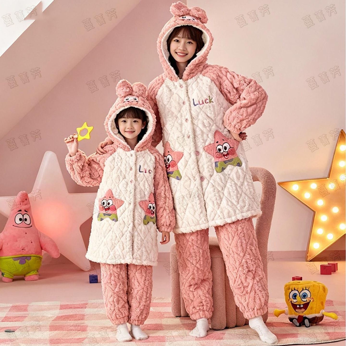 儿童睡衣母女睡袍冬季三层夹棉加绒加厚派大星女童亲子家居服套装