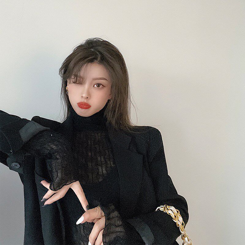大码胖妹妹高领网纱内搭打底衫女春秋冬新款加绒蕾丝性感长袖上衣