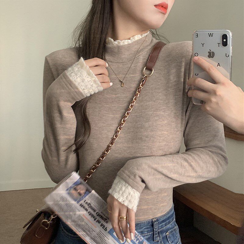 加绒蕾丝打底衫女秋冬新款大码胖妹妹内搭长袖半高领加厚上衣小衫