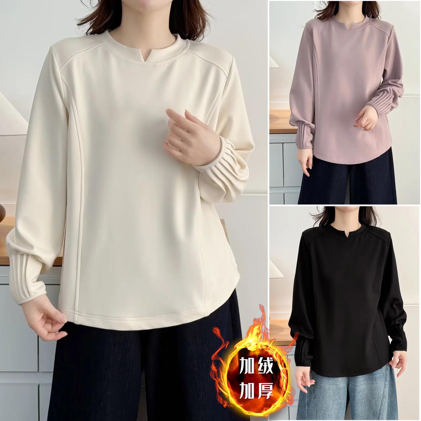 大码女装冬装胖妹妹加绒加厚200斤褶皱中年女上衣正肩圆领打底衫