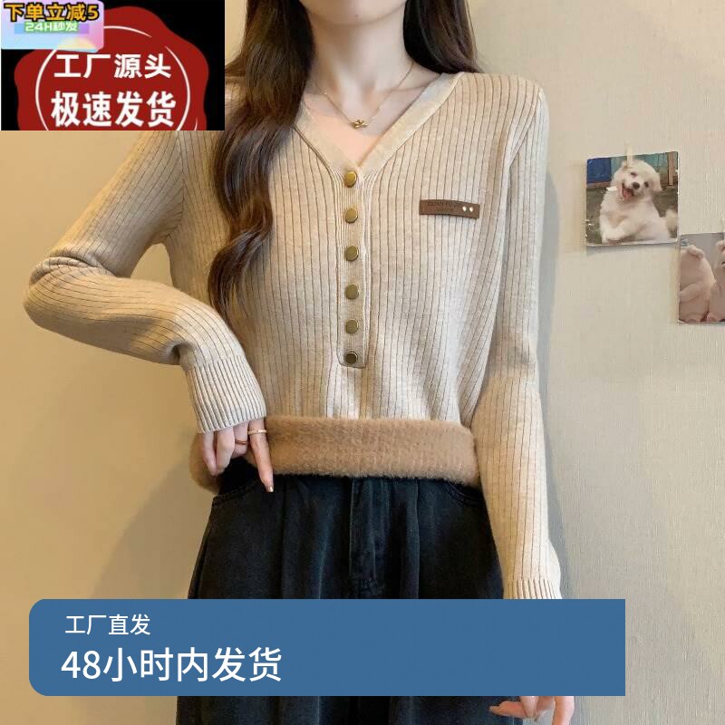 大码女装加绒加厚一体绒V领毛衣女秋冬胖妹妹百搭显瘦针织打底衫