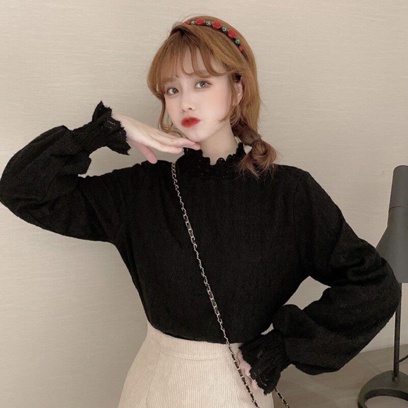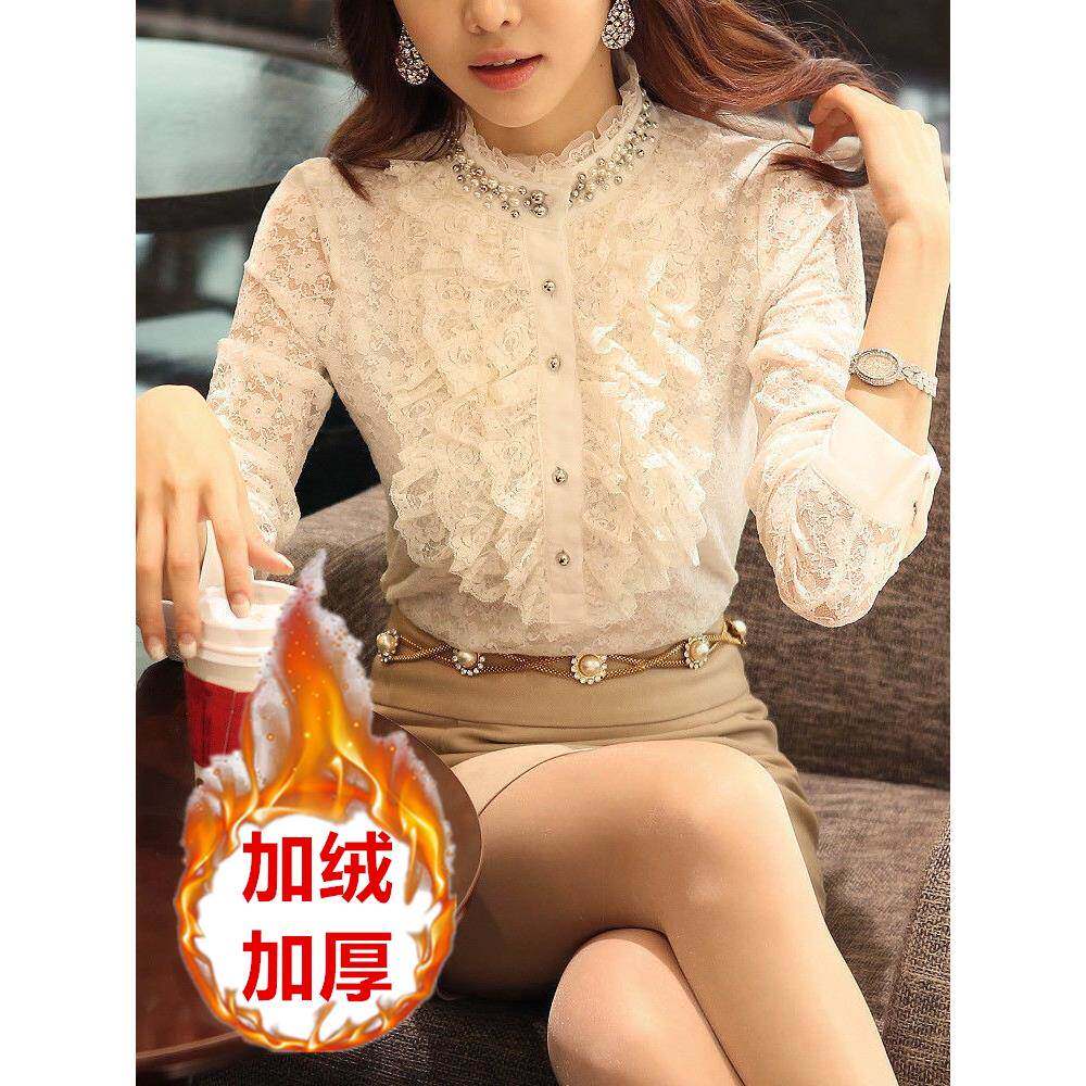 大码胖妹妹半高领磨毛蕾丝衫女春秋冬内搭花边领加绒网纱打底上衣